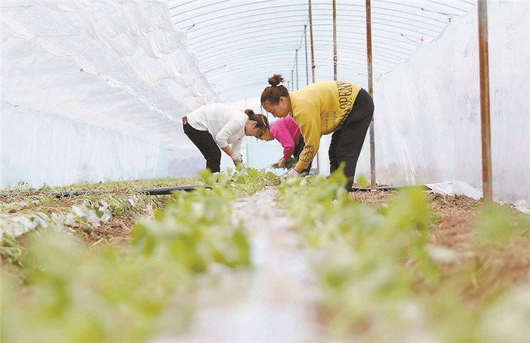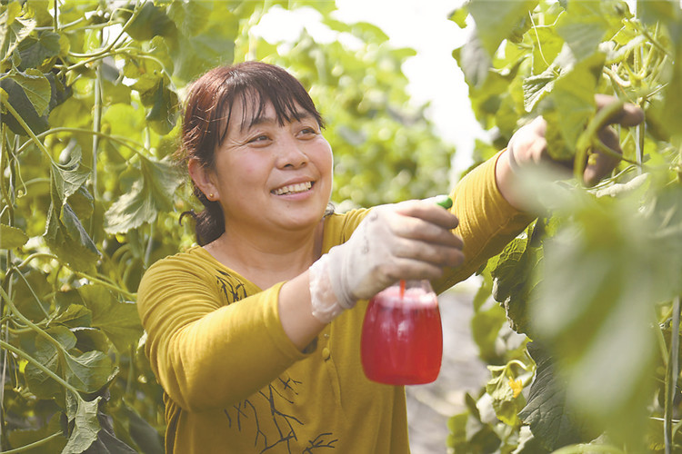 大城县里坦镇里坦一村村民在果蔬大棚内为甜瓜幼果授粉。 通讯员张艺典摄