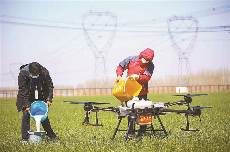 永清县龙虎庄乡朱家营村百亩麦田内,村民正在为植保无人机装填药剂。通讯员黄磊摄
