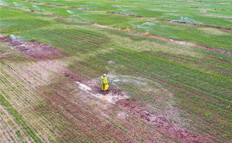文安县益农农业种植合作社基地,种植户利用地埋式伸缩喷灌为小麦浇返青水。通讯员郑佳庆、高丹钰摄