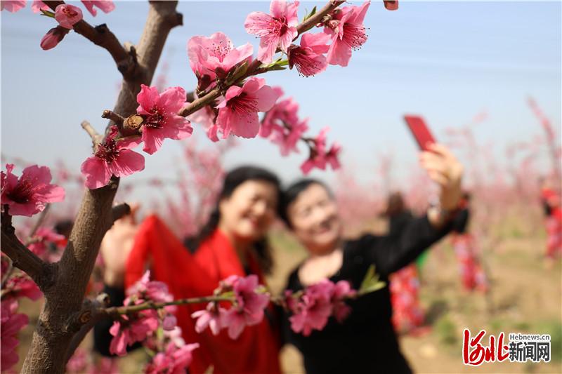 在河北省隆尧县隆尧镇农业特色观光园中,游客在桃花园里自拍。