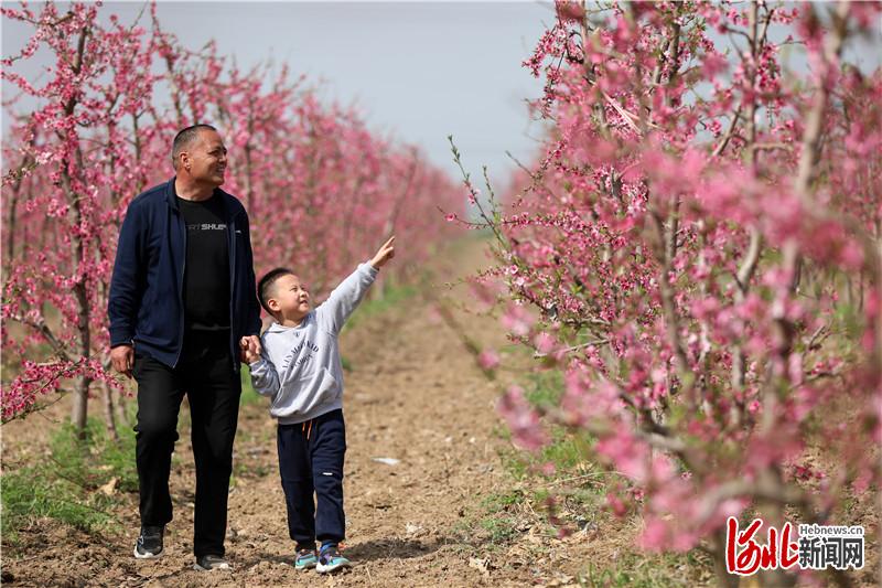 在河北省隆尧县隆尧镇农业特色观光园中,游客在桃花园里赏花游玩。
