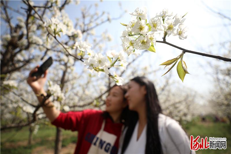 在河北省隆尧县牛桥乡休闲观光农业基地,游客在梨花园里自拍。