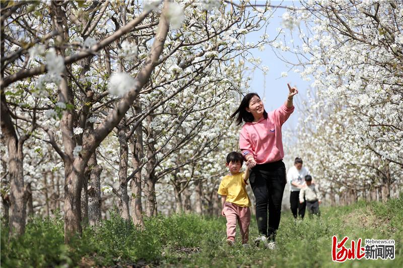 在河北省隆尧县牛桥乡休闲观光农业基地,游客在梨花园里赏花游玩。