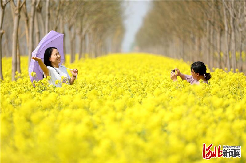 在河北省隆尧县牛桥乡休闲观光农业基地,游客在油菜花园里拍照。