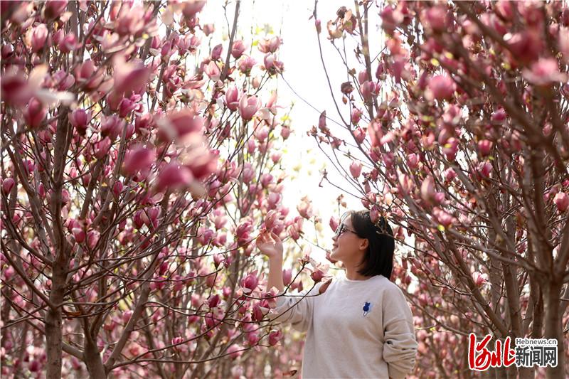 在河北省隆尧县牛桥乡休闲观光农业基地,游客在玉兰园里赏花游玩。
