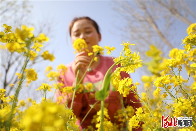 在河北省隆尧县牛桥乡休闲观光农业基地,游客在油菜花园里赏花游玩。