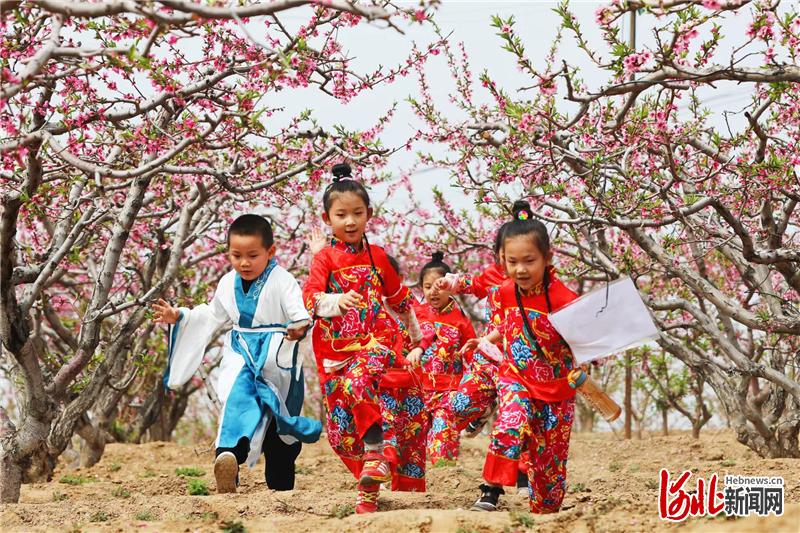 图为小朋友在河北省张家口市桥东区姚家庄镇王家寨村桃林中赏花、写生,快乐玩耍。