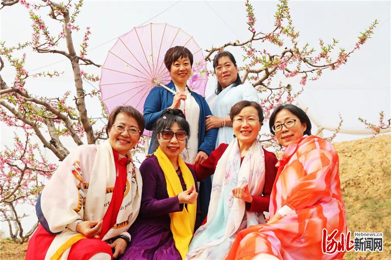 图为市民在河北省张家口市桥东区姚家庄镇王家寨村桃林中观景留影。