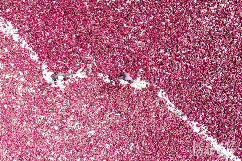 2021年10月23日,河北省邢台市内丘县扁鹊药谷中药材种植基地工人在晾晒中药材鸡冠花(无人机照片)。 通讯员 刘继东 摄影报道