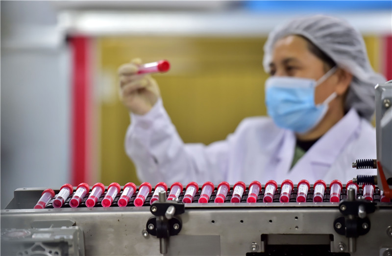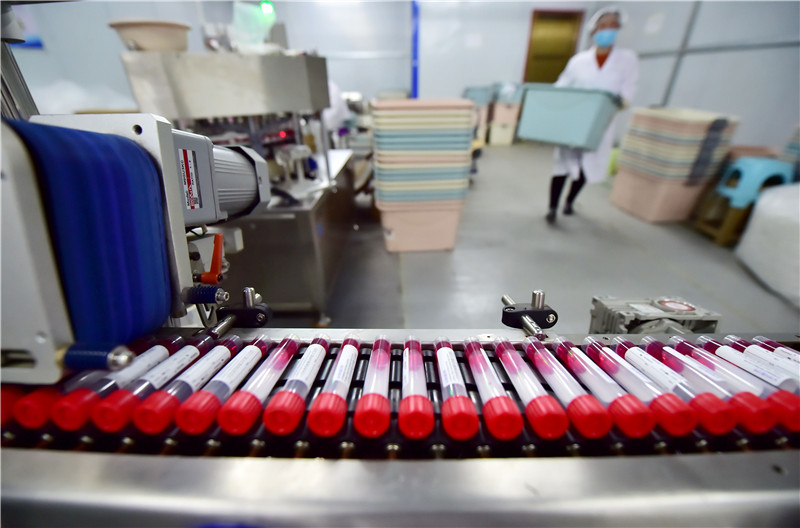 11月9日,在河北省石家庄市元氏县的一家医疗用品生产企业,工人在采样管生产车间作业。
