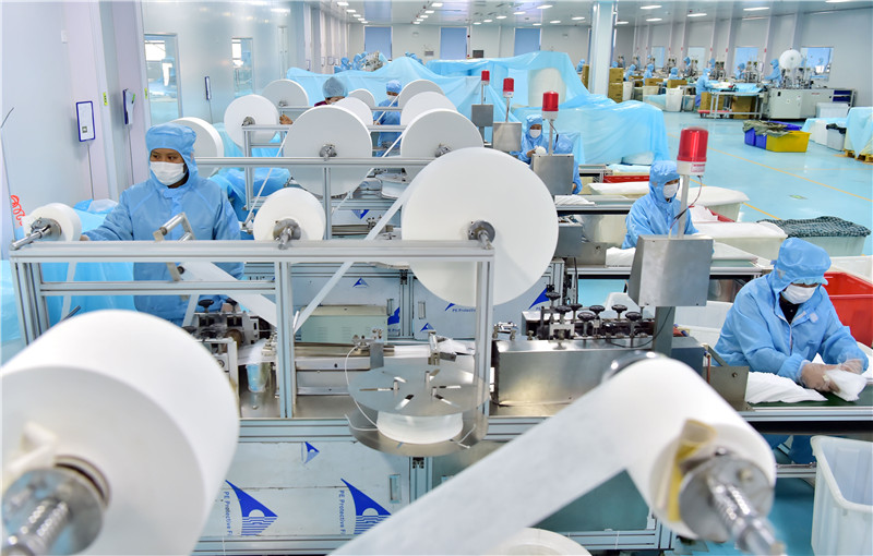 连日来,河北省石家庄市的医护、医疗用品生产企业在严格落实好疫情防控措施的前提下,调配力量加紧生产,保障防疫用品供应,助力疫情防控。 新华社发(许建园 摄)