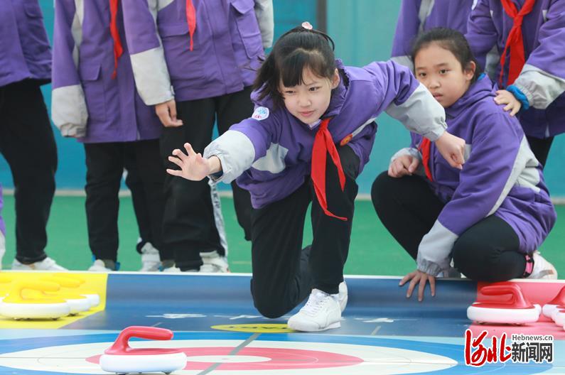 图为11月3日,“冰雪大篷车”走进张家口市桥东区卫华小学,孩子们正在体验陆地冰壶运动。河北日报通讯员岑屹摄