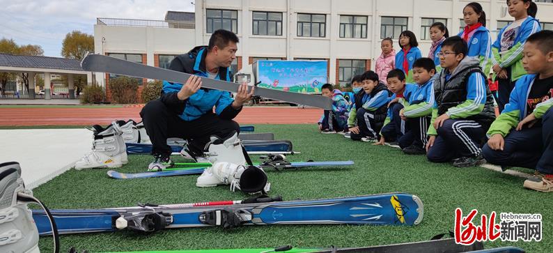图为“冰雪大篷车”走进张北县察哈尔小学,滑雪教练在为现场师生讲解雪具使用方法。河北日报通讯员刘郁雯摄