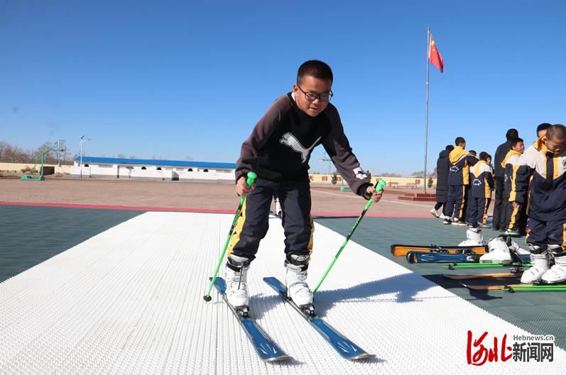 图为“冰雪大篷车”走进张北县小二台镇中心小学,一名学生正在体验滑雪。河北日报通讯员夏培真摄