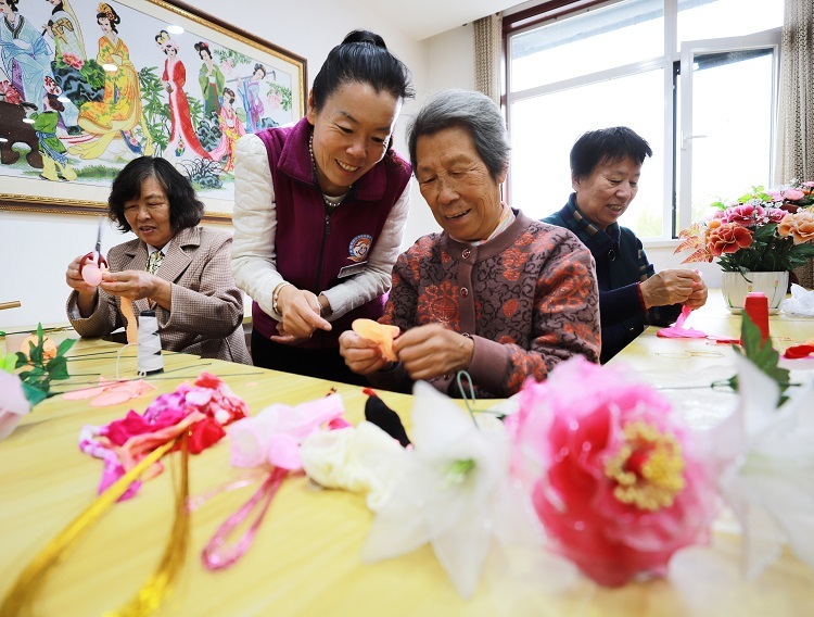 河北省玉田县敬德养老公寓工作人员陪同老人制作手工花卉。李洋 摄