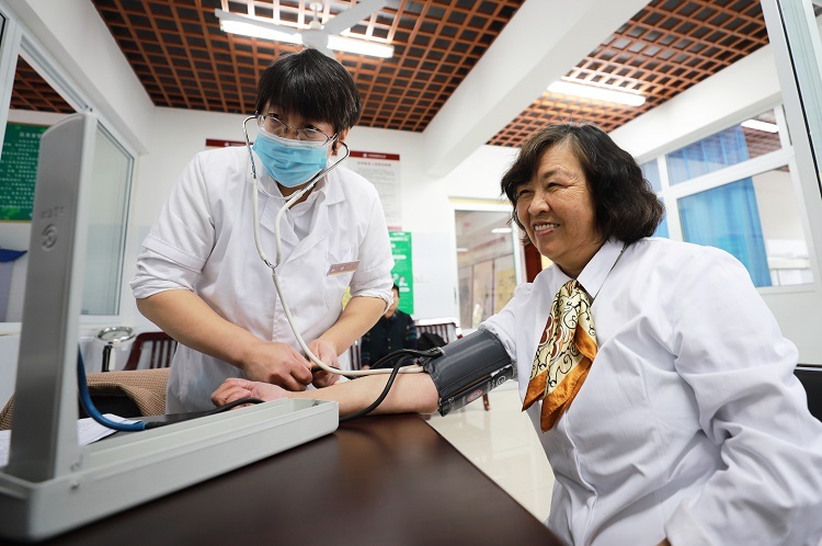 医生在河北省玉田县敬德养老公寓为老人测量血压。李洋 摄