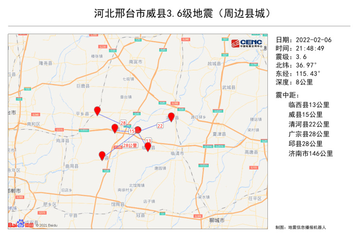 中国地震台网正式测定:02月06日21时48分在河北邢台市威县(北纬36.97度,东经115.43度)发生3.6级地震,震源深度8千米。