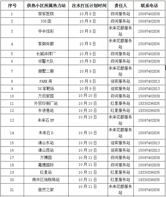 以上计划表仅作为部分小区注水试压时间说明,具体时间以纸质通知单为准,请热用户及时关注小区单元门口或告示牌张贴的注水试压通知。