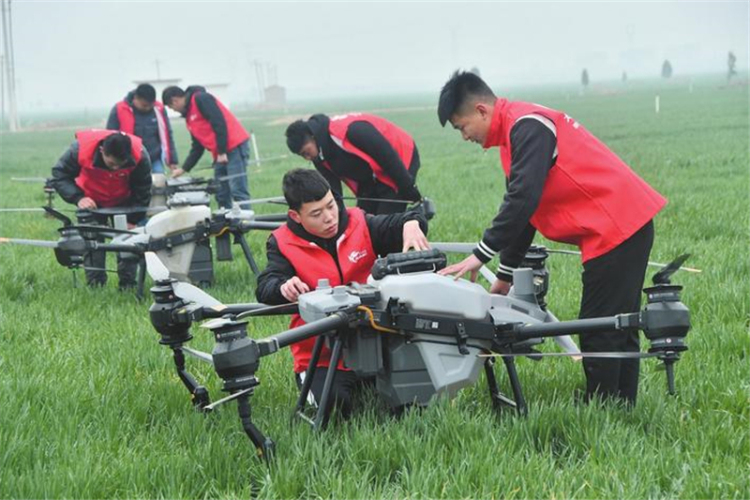 近日,在永年区小龙马乡曹八汪村“科技壮苗”培训现场,久茂植保服务队成员正在调试植保无人机。