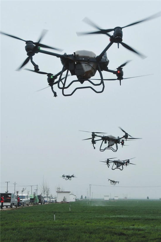 近日,在永年区小龙马乡曹八汪村“科技壮苗”培训现场,久茂植保服务队成员正操作无人机在麦田里开展喷防作业。