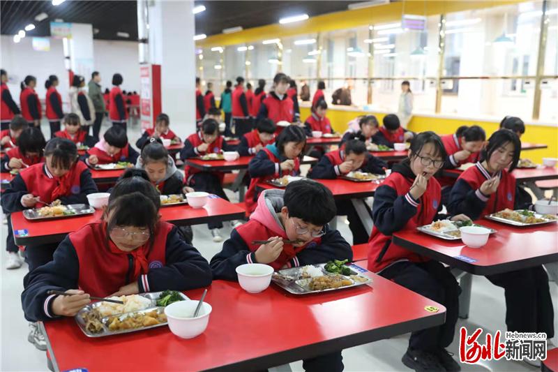 图为首批进城读书的乡村小学学生在河北省张家口市桥东区第21中学餐厅内吃午饭。