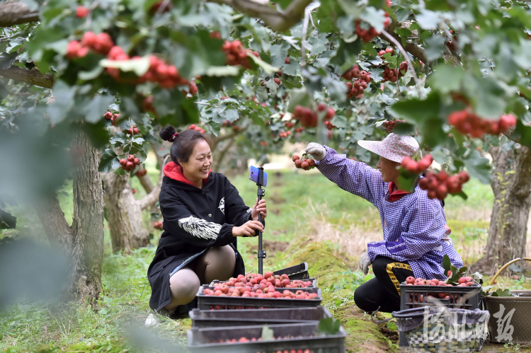 2021年10月19日,在河北省石家庄市晋州西贾庄村山楂种植园里,当地果农通过网络直播山楂采摘增加销售渠道。