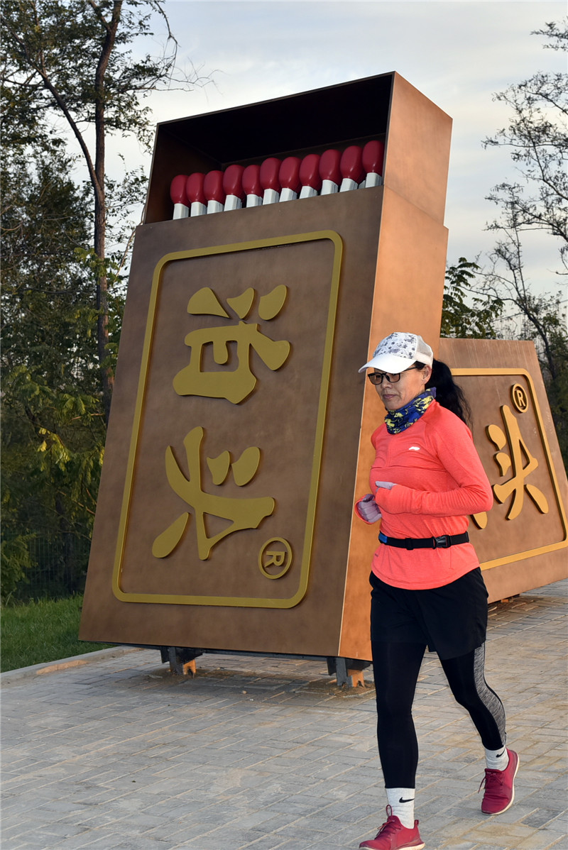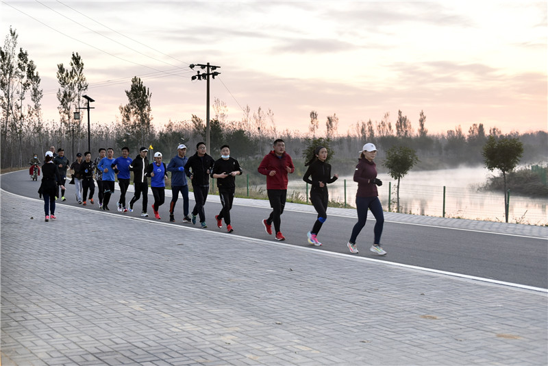 10月23日,市民在泊头市大运河堤顶路上跑步健身。