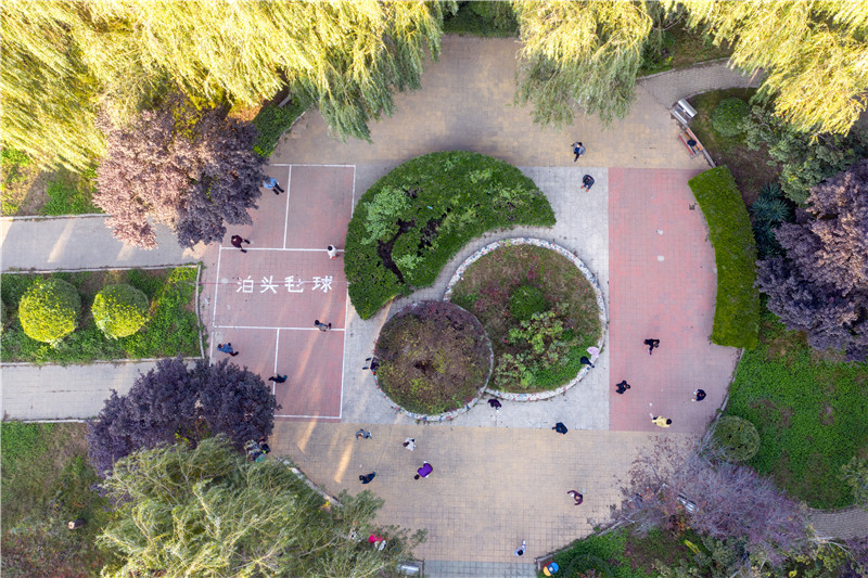 10月23日,市民在泊头市大运河生态公园踢毽子(无人机照片)。