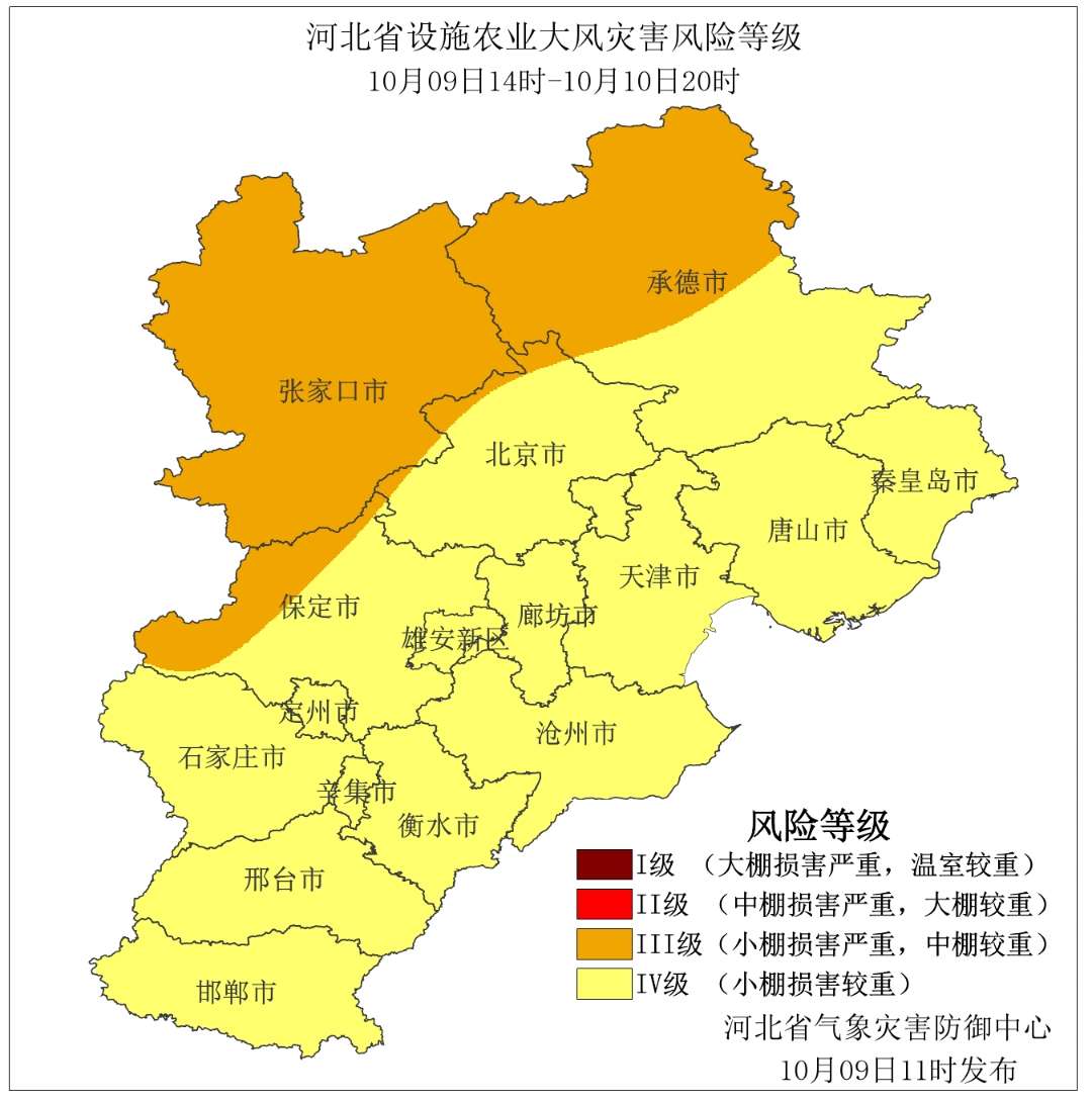 10月9日11时,省气象灾害防御中心发布设施农业大风灾害风险等级预报,受大风天气影响,9日下午到10日,河北省大部分地区设施农业大风灾害风险等级在Ⅳ级及以上,大风可能造成小棚棚膜破裂,其中,张家口、承德北部、保定西部地区设施农业大风灾害风险等级为Ⅲ级,大风可能造成小棚棚膜破裂、棚架折断,中棚棚膜破裂,请注意防范。