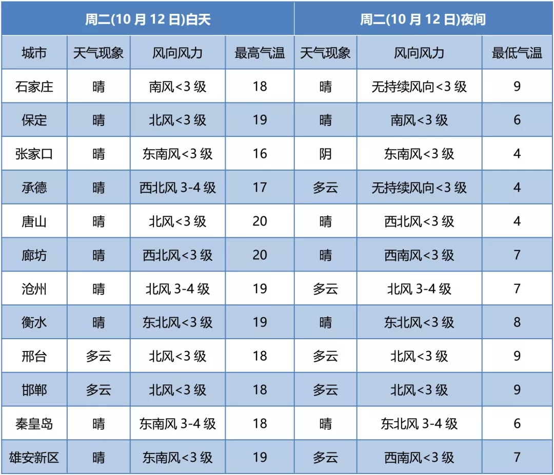 12日白天,张家口西部、保定西部、石家庄、邢台、邯郸晴转多云,其他地区晴间多云。