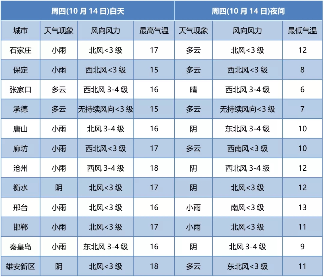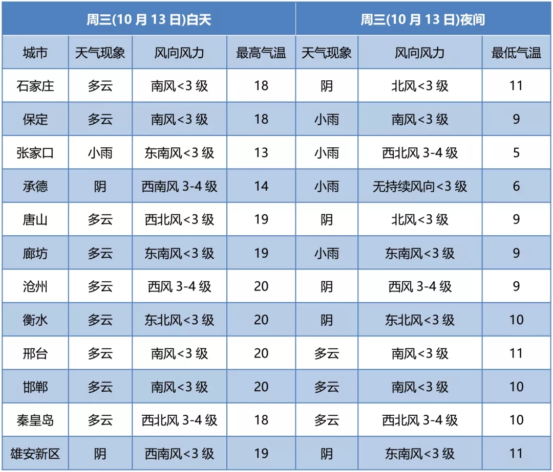 13日夜间到14日,张家口、承德中北部、保定中北部和石家庄、邢台、邯郸三个地区的西部阴有小雨或零星小雨,其他地区多云间阴。